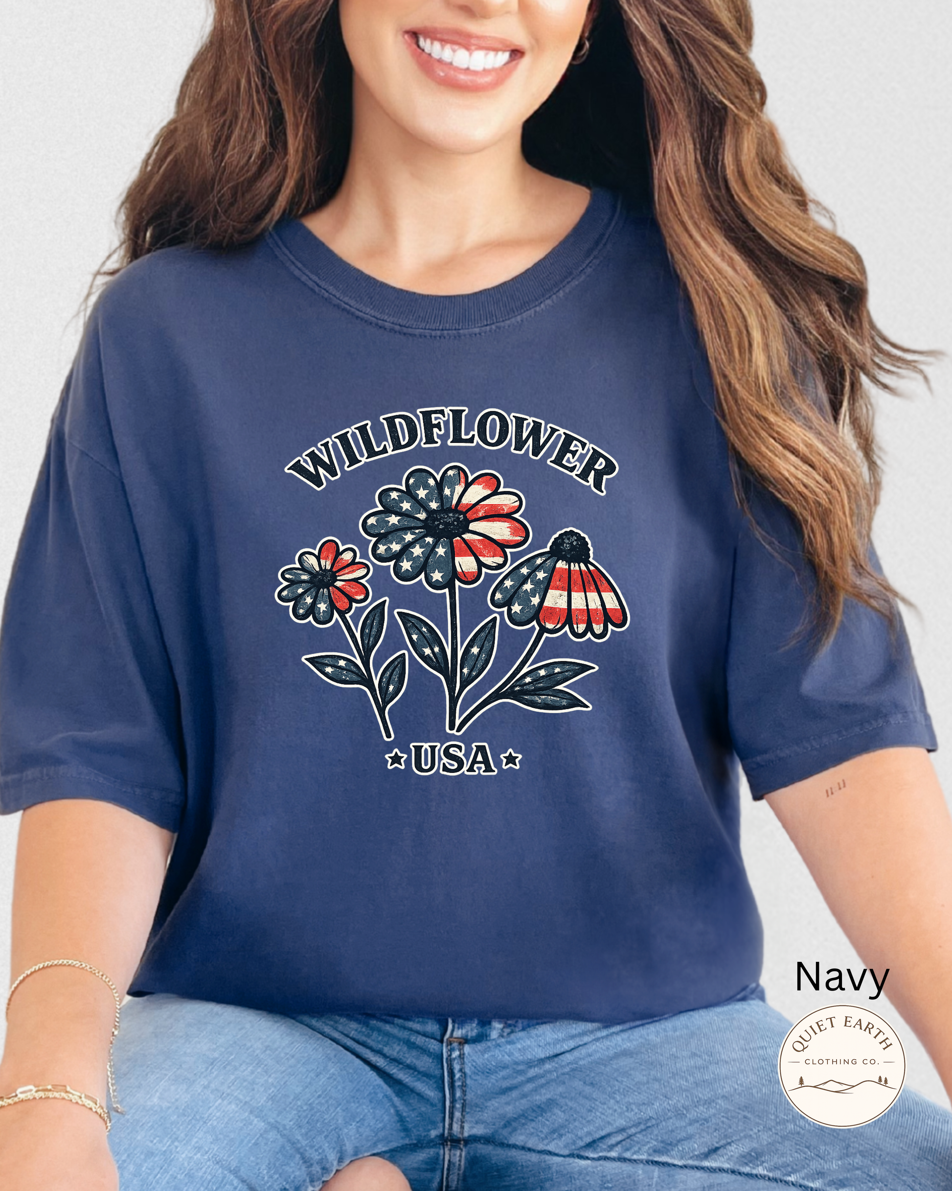 This Wildflower USA Comfort Colors® 1717 tee blends classic Americana with a soft, feminine touch. Featuring bold “USA” lettering paired with red, white, and blue wildflower graphics, this design gives patriotic charm. Meet your new favorite patriotic tee